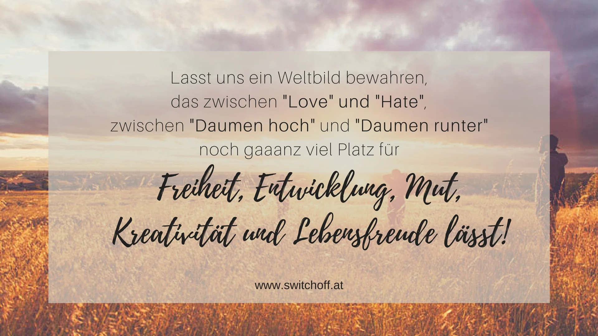 Und ein Weltbild bewahren, das zwischen "Love" und "Hate", zwischen "Daumen hoch" und "Daumen runter" noch GANZ VIEL PLatz für Freiheit, Entwicklung, Toleranz, Mut, Kreativität und Lebensfreude lässt!